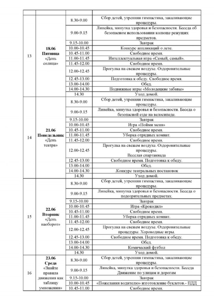 Меню школьной столовой во время летнего оздоровительного лагеря